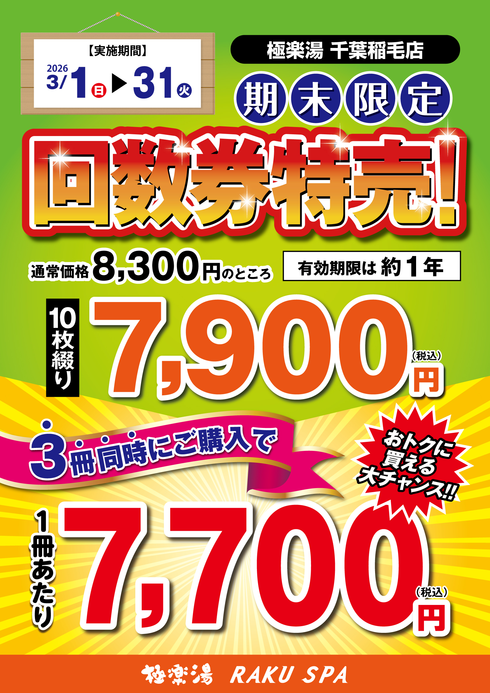 | 回数券 | 3/1~3/31 回数券特売実施中 1冊(10枚綴り)「7,900円」 3冊同時購入で1冊「7,700円」(計23,100円) |