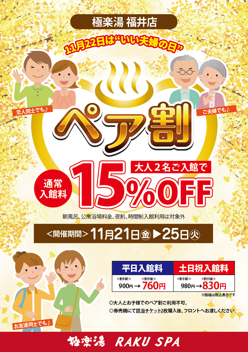 | 備考 | ・土日祝の午前7~9時は朝風呂(料金850円)を実施しております。 【入浴料金(※内湯のみ利用可能です)】 大人(12歳以上): 490円 / 中人(6歳~11歳): 160円 小人(5歳以下) : 70円 ※内湯料金の方が露天エリアを利用した場合、2,000円(税込)をお支払い頂きます。 ※ルール違反者を発見した場合、今後の利用をご遠慮頂く場合がございます。ご注意ください。 ※福井県の条例により令和4年7月1日以降、7歳以上のお子様とは混浴ができません。 ・レンタルバスタオル 220円 その他レンタル品販売品等はお問合せをお願い致します。 歯ブラシ、かみそり、化粧落としなども販売しております。 |
