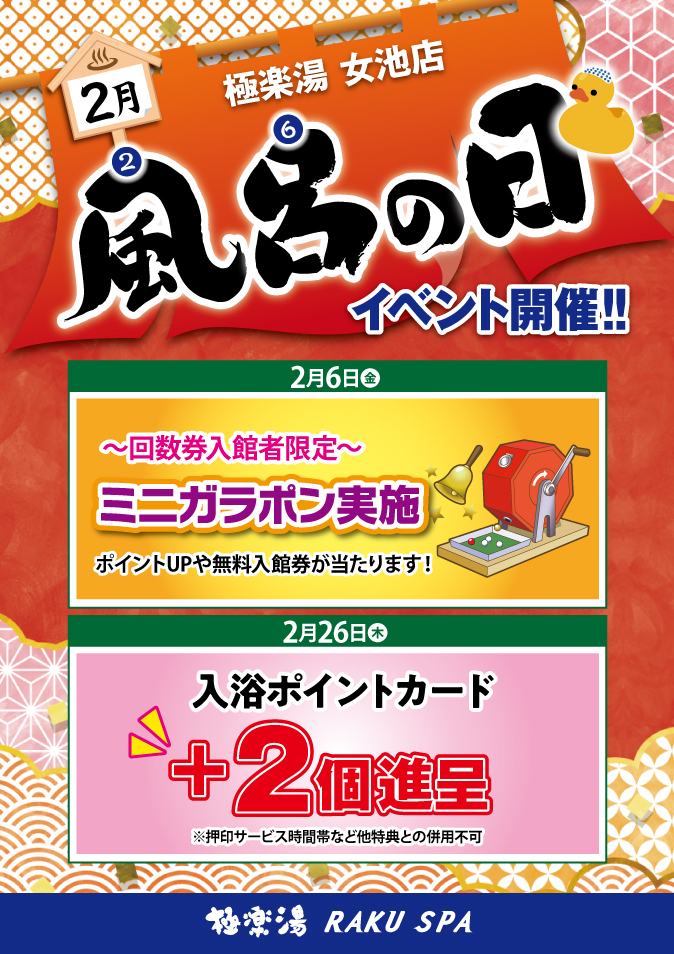 | 営業時間 | 【お風呂】 平日・祝日 10:00〜24:00 <入浴受付時間 10:00〜23:30> 土・日 6:00~24:00 <入浴受付時間 6:00~23:30>