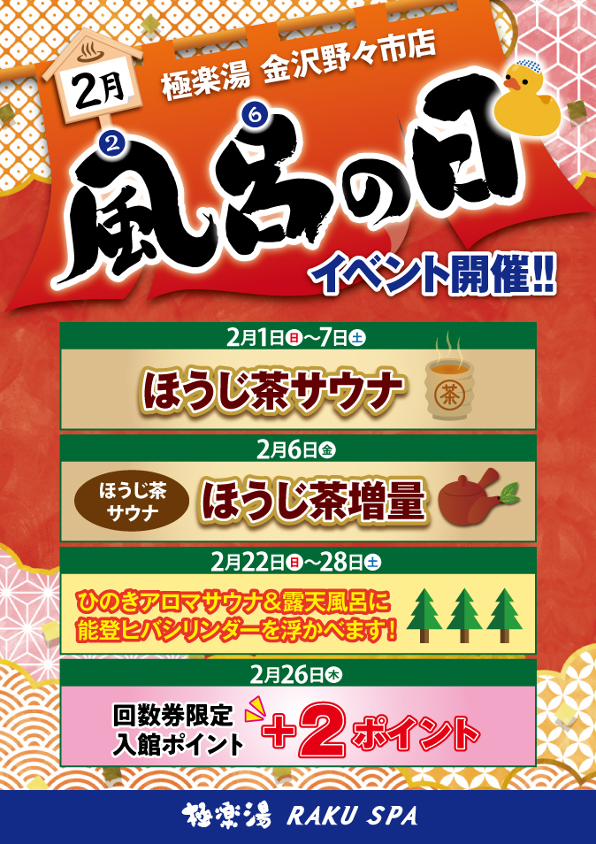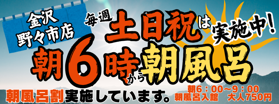 | 営業時間 | お風呂の営業時間 平日 9:00~25:00(最終受付 24:20) 土日祝 6:00~25:00(最終受付 24:20)