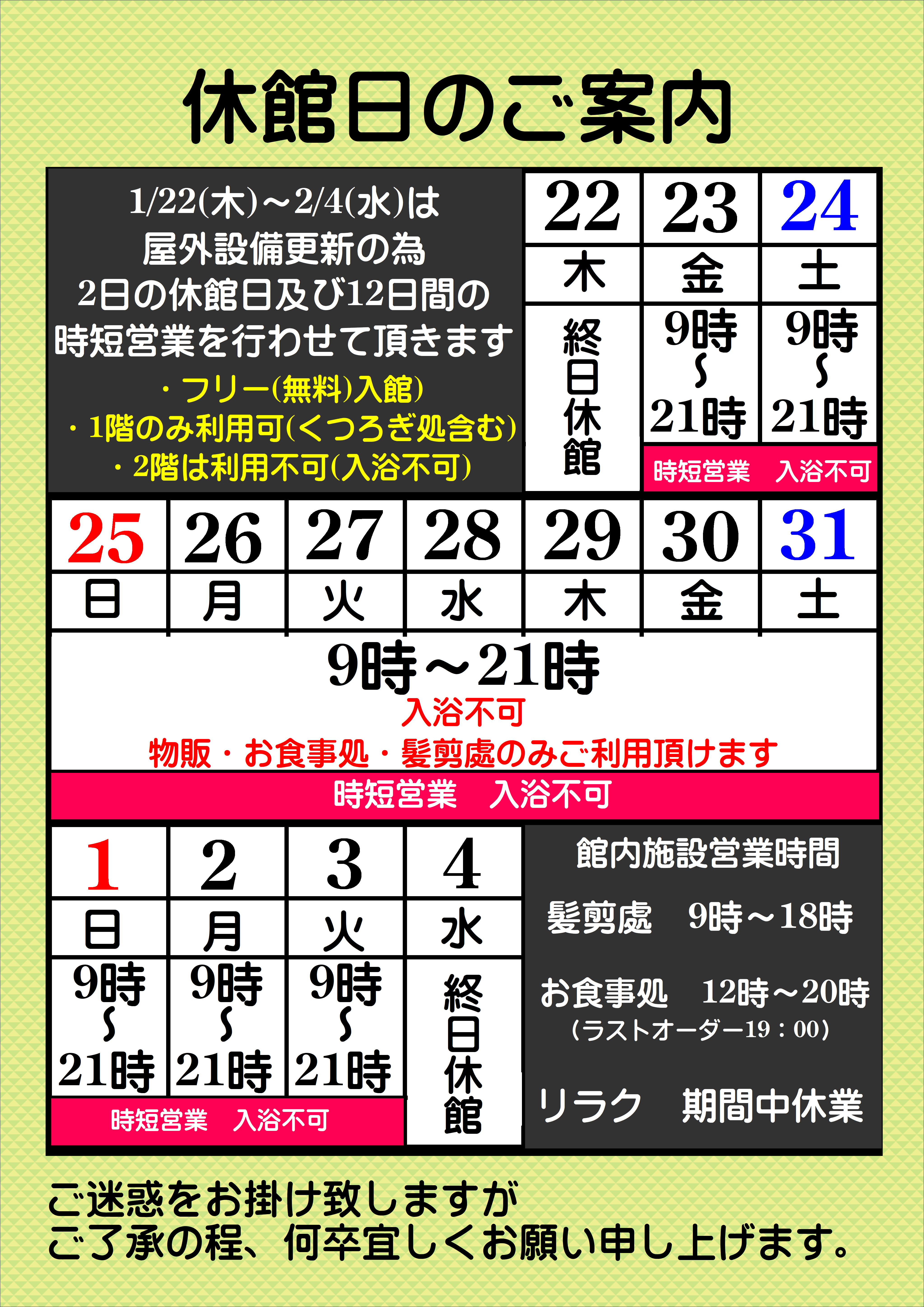 | ※価格はすべて税込表記となっております。 ※5才以下のお子様の入浴料は無料です。 ※お子様のみのご入浴はお断りしております。 |
