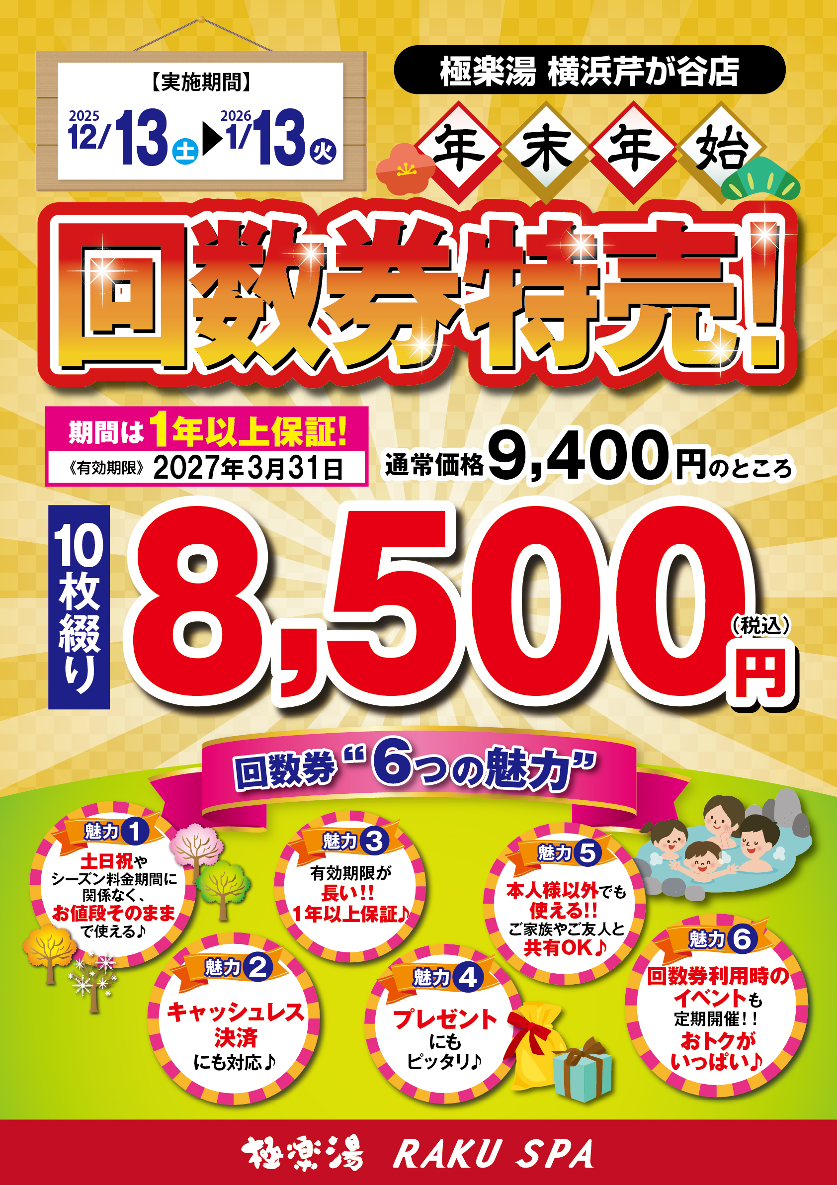 | ★入館料QR決済対応、その他一部館内利用のお支払いは現金のみ。 ★表示は税込です。 ★3才以下のお子様は入館料無料! (おむつの取れていないお子様はベビーバス無料貸し出し!) ★ハマハグ優待カードご利用いただけます! ★お食事やほぐし処のお会計はキャッシュレス決済可能! |