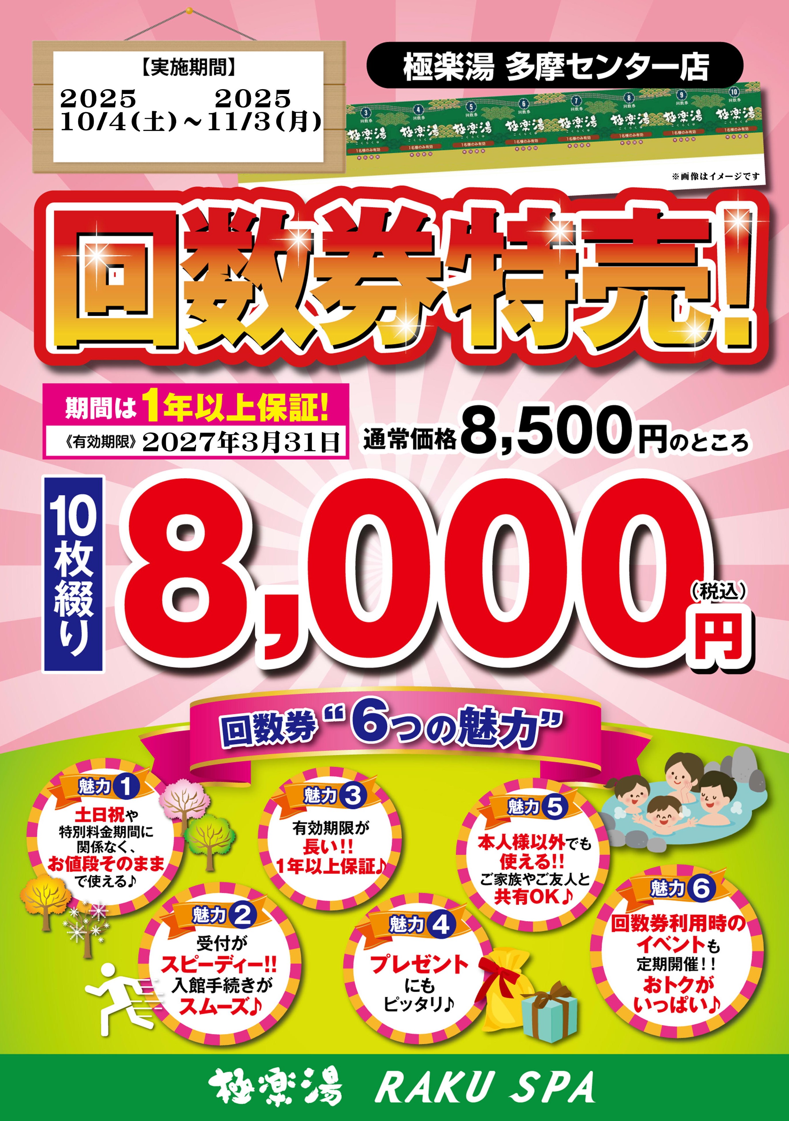 ・当店の入館料は現金・QRコード決済となります。 入館回数券のお支払いは現金のみとなっております。 予めご了承くださいませ。 ご利用いただけるQR決済は以下の通りとなります PayPay、LINE Pay、楽天ペイ、d払い、メルペイ、au pay ・館内のご利用分(リラク・飲食,物販等)はクレジット決済、 ICカード決済(PiTaPaはご利用いただけません)、 QRコード決済も可能です。 ・7歳以上または身長120cm以上の異性の混浴は、 お断りしております。 ・中学生未満のみでのご入館はご遠慮いただいておりますので、 保護者様ご同伴でのご来館をお願い致します。 また、16歳未満(中学生以下)のお子様のみでの21時以降の 館内ご利用、16歳以上18歳未満のお子様のみでの22時以降の 館内ご利用は東京都青少年の健全な育成に関する条例により ご遠慮下さいませ。 ・お身体に刺青(タトゥー)等がある方はご入館いただけません。 また、タトゥーシール等をご利用の方はご入館前に剥がして いただきますようお願いします。 ・恐れ入りますが生理中の方のご入浴はお断りさせて いただいております。 |