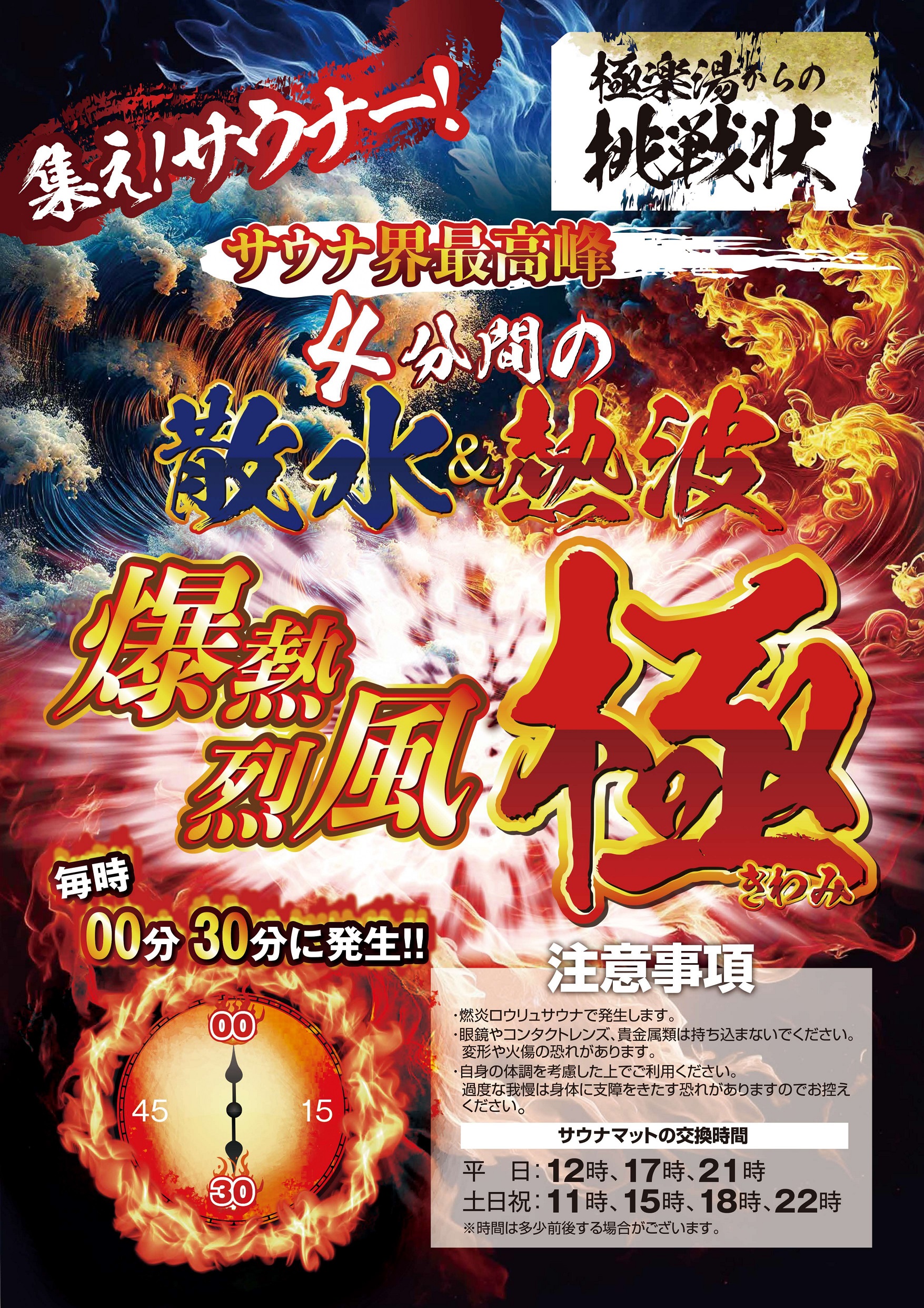 | 備考 | 極楽湯タオル 220円 レンタルバスタオル 220円 タオルセット 440円 歯ブラシ 120円 カミソリ(男女) 170円 館内着 270円 (すべて税込) お支払いは各種クレジットカード、電子マネー、QR決済がご利用可能です。 |