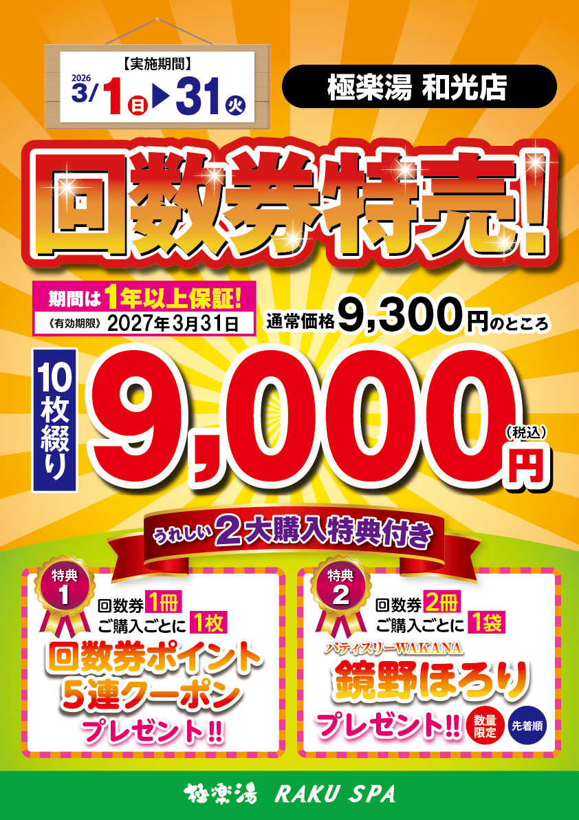 | 回数券 | 9,300円(有効期限:2027/3/31迄) |